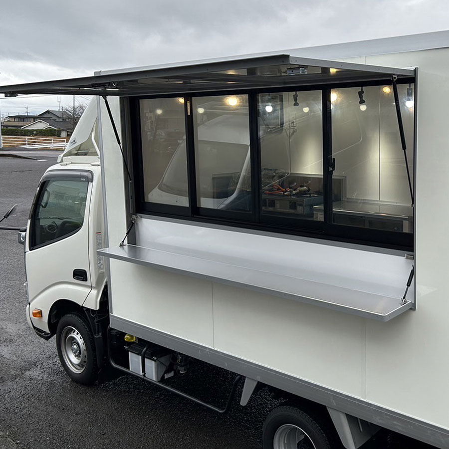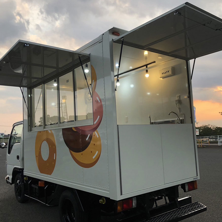 インパクトのあるキッチンカー・移動販売車の製作が可能。2~3人でも調理・販売できる広さがあり、大型イベントにも対応できます。